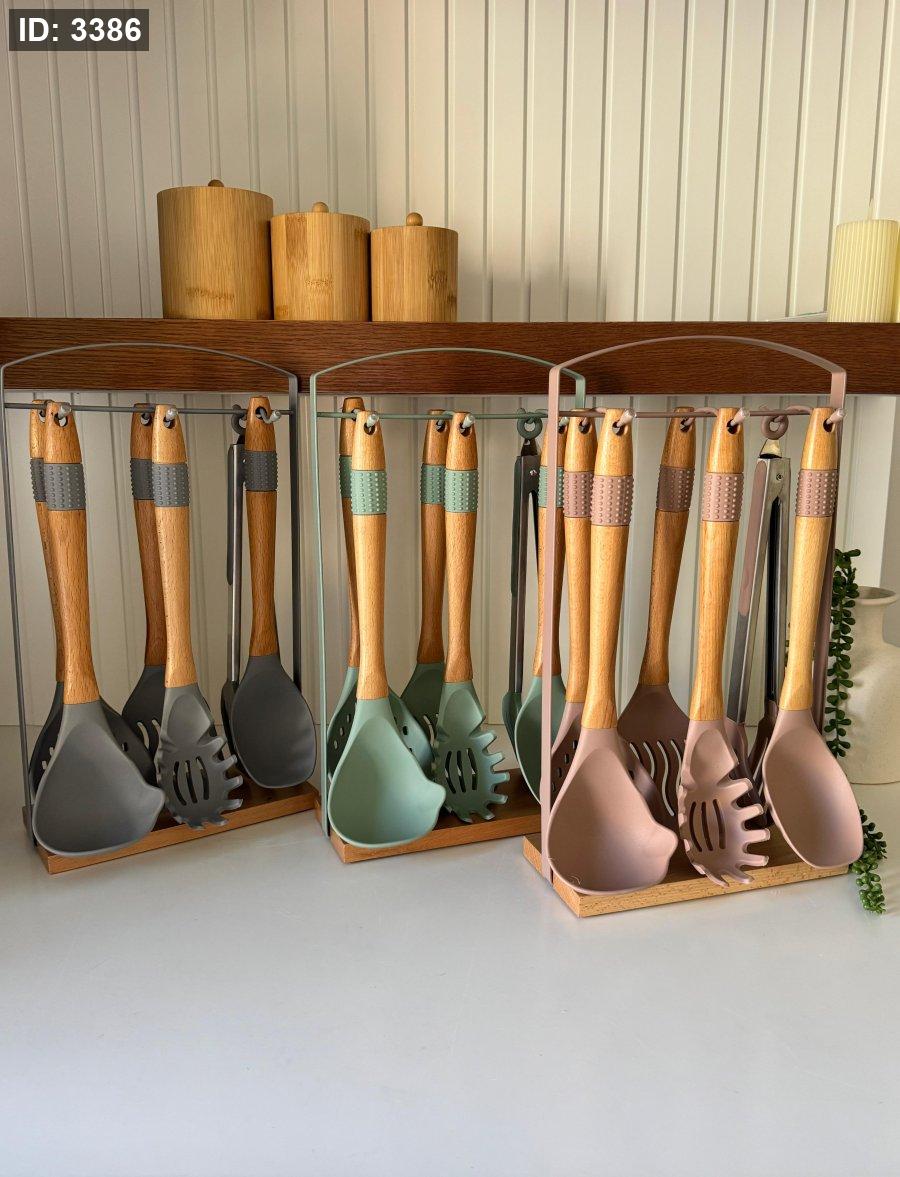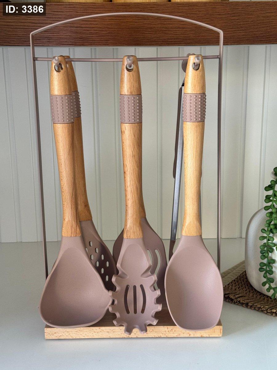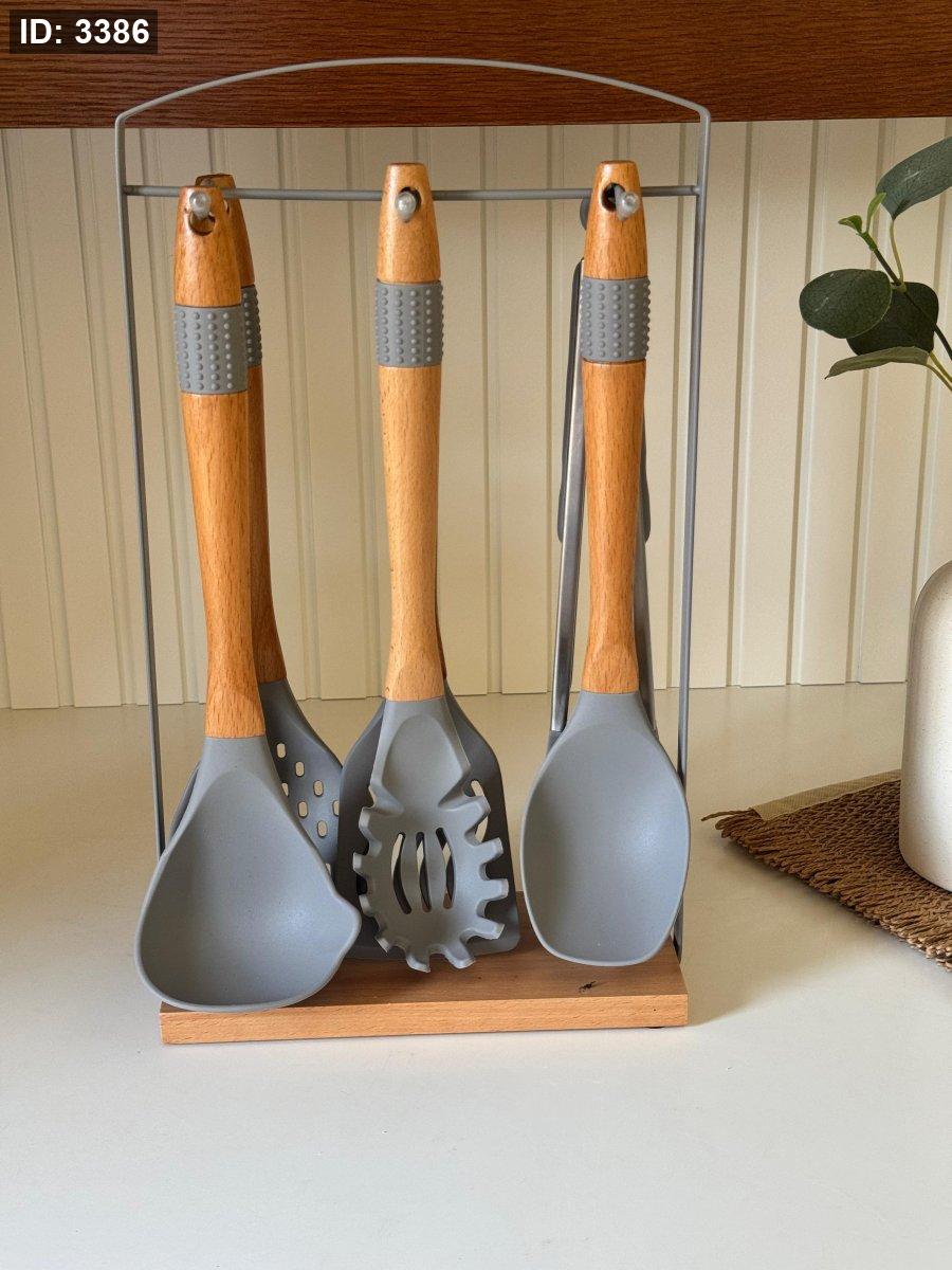 طقم مغارف سيليكون ستاند معدن قاعده خشب7قطع