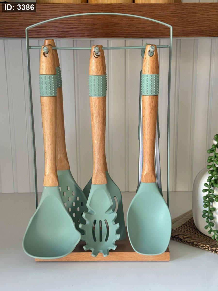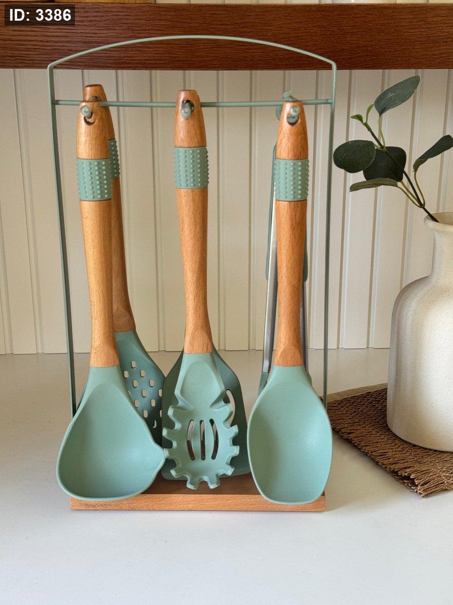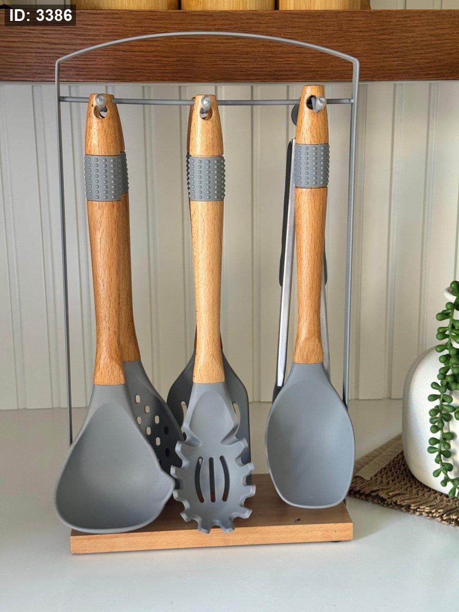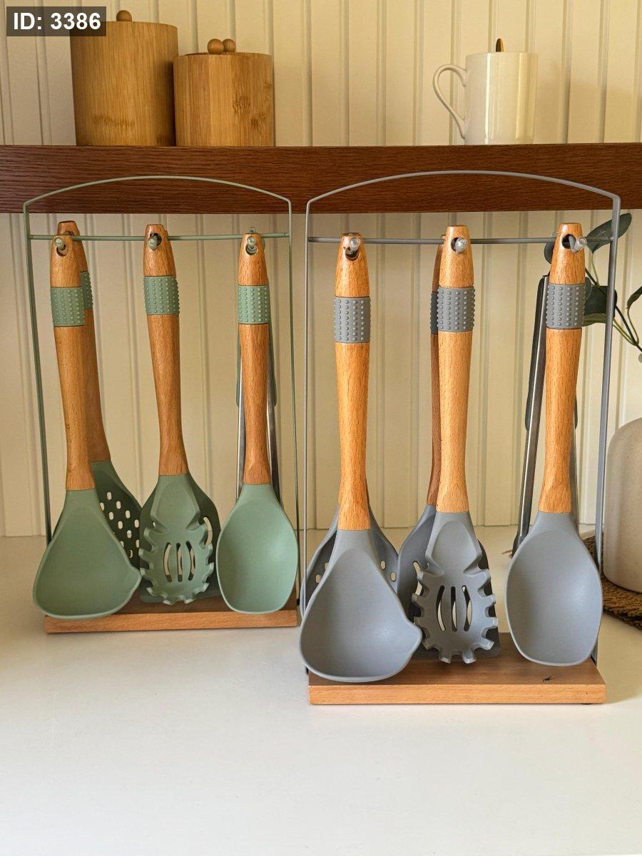 طقم مغارف سيليكون ستاند معدن قاعده خشب7قطع