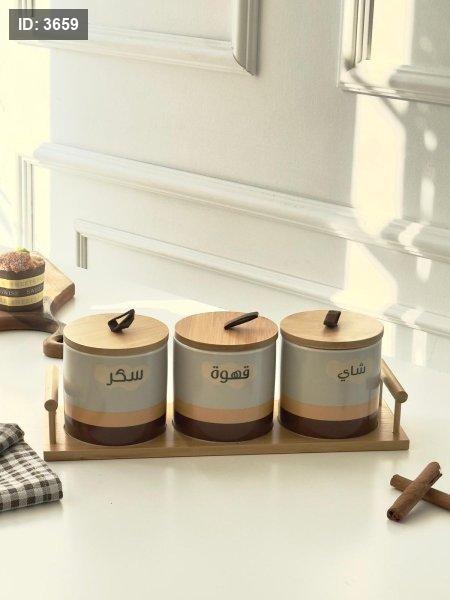 طقم سكريات بورسلان 3 قطع + قاعده بامبو