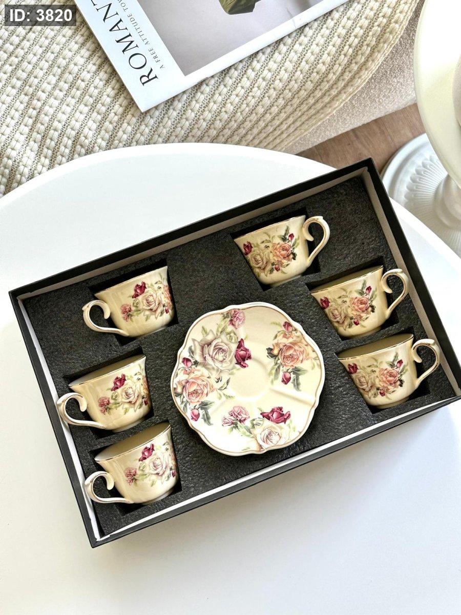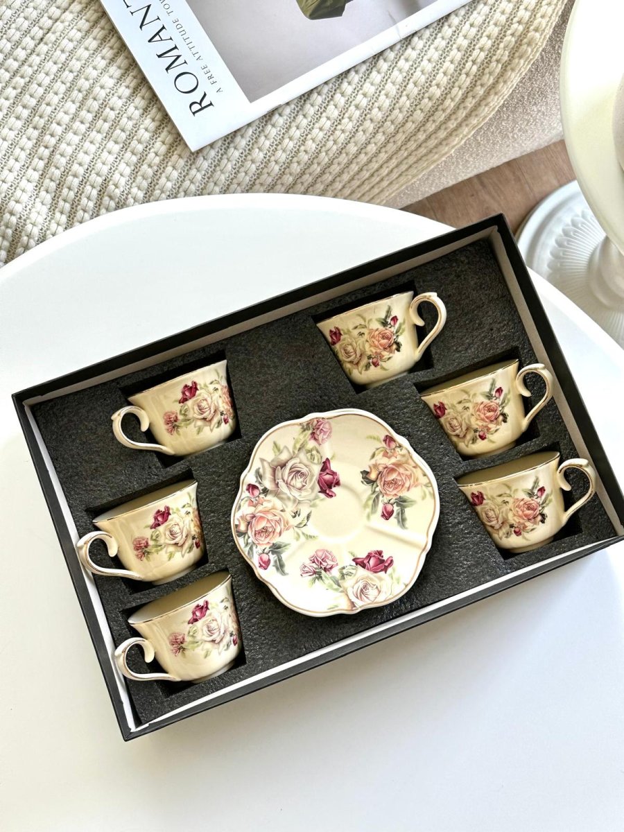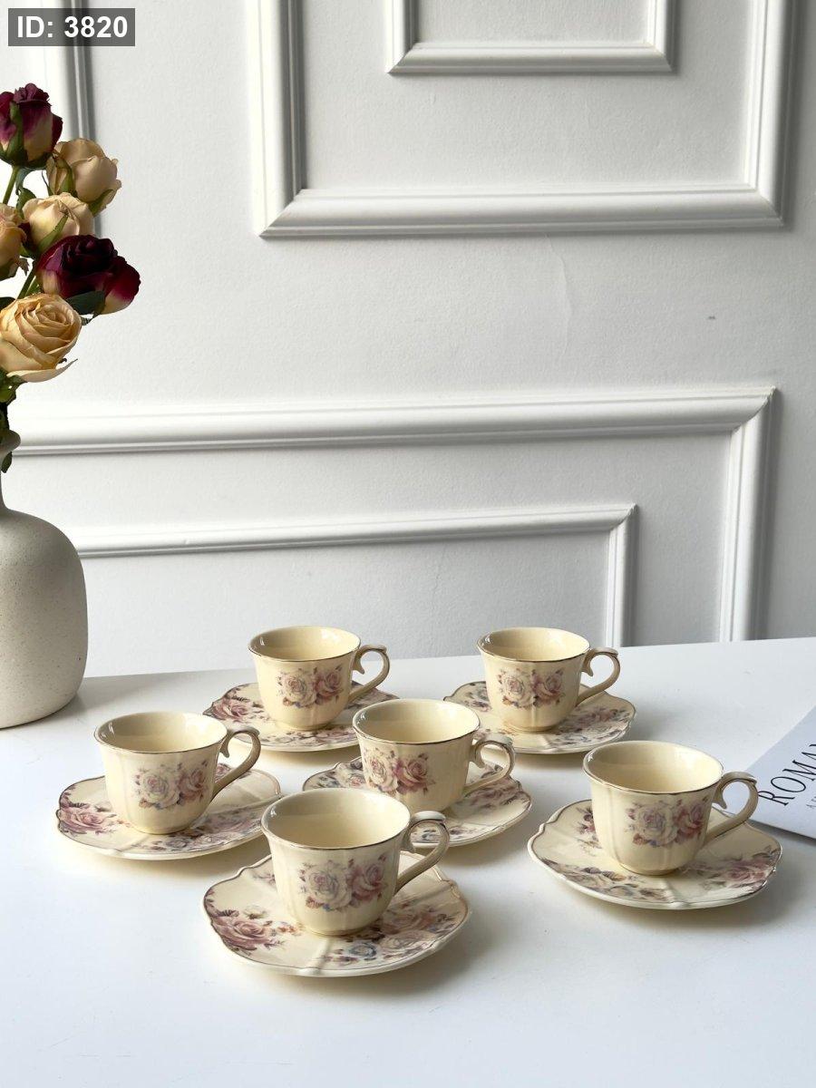 طقم فناجين قهوه 6+6 بورسلان مورد انجليزي مذهب
