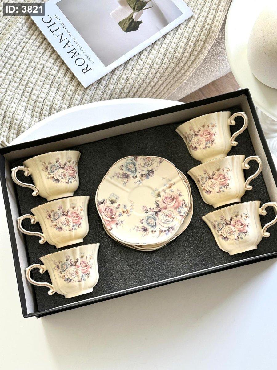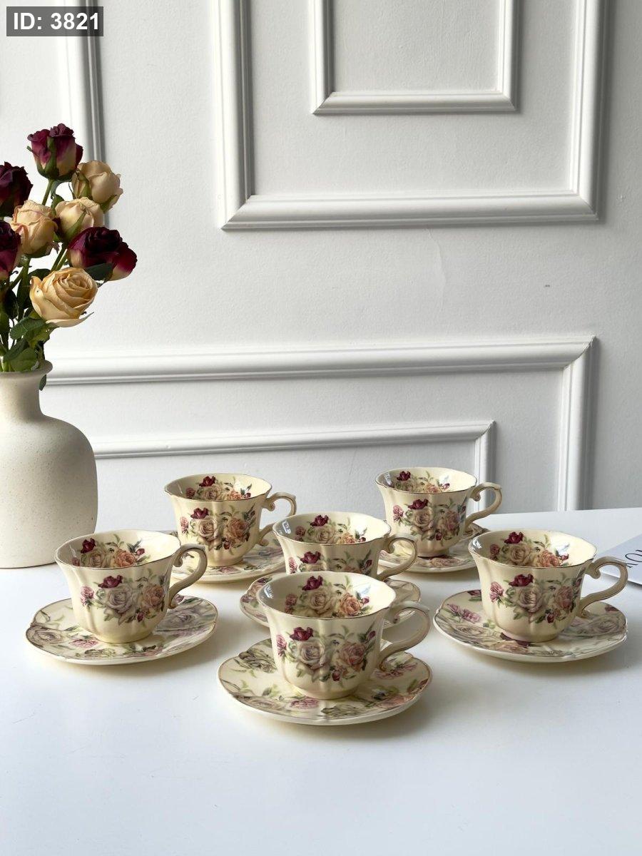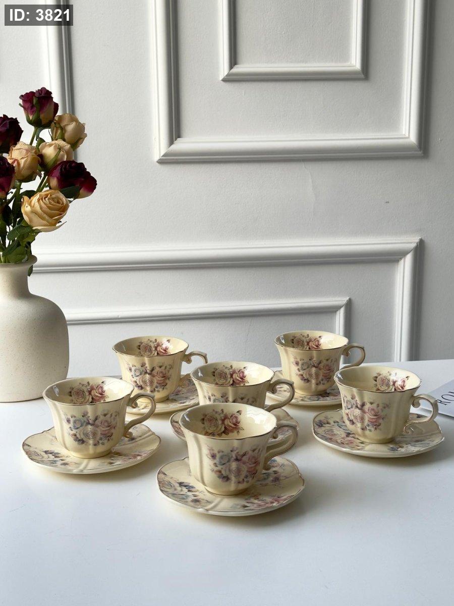 طقم فناجين شاي 6+6 بورسلان مورد انجليزي مذهب