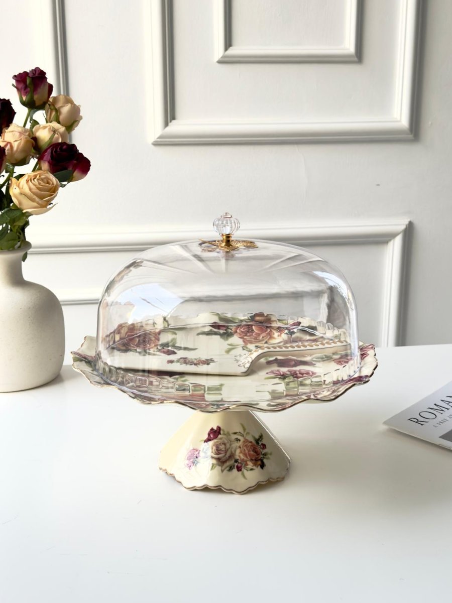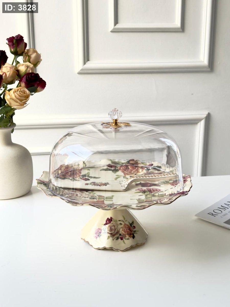 جاط كيك برجل مدور غطا اكرلك + معلقه بورسلان مورد انجليزي مذهب