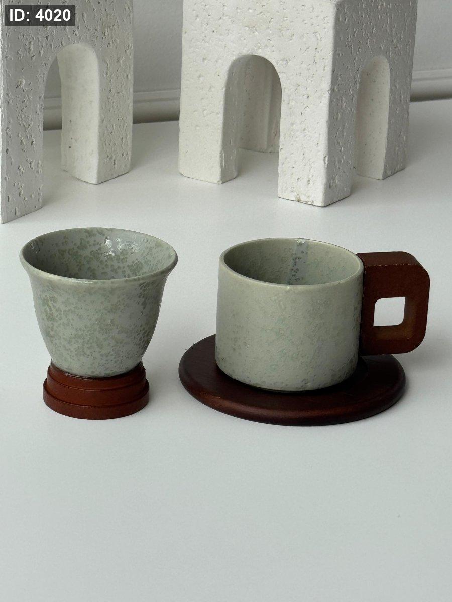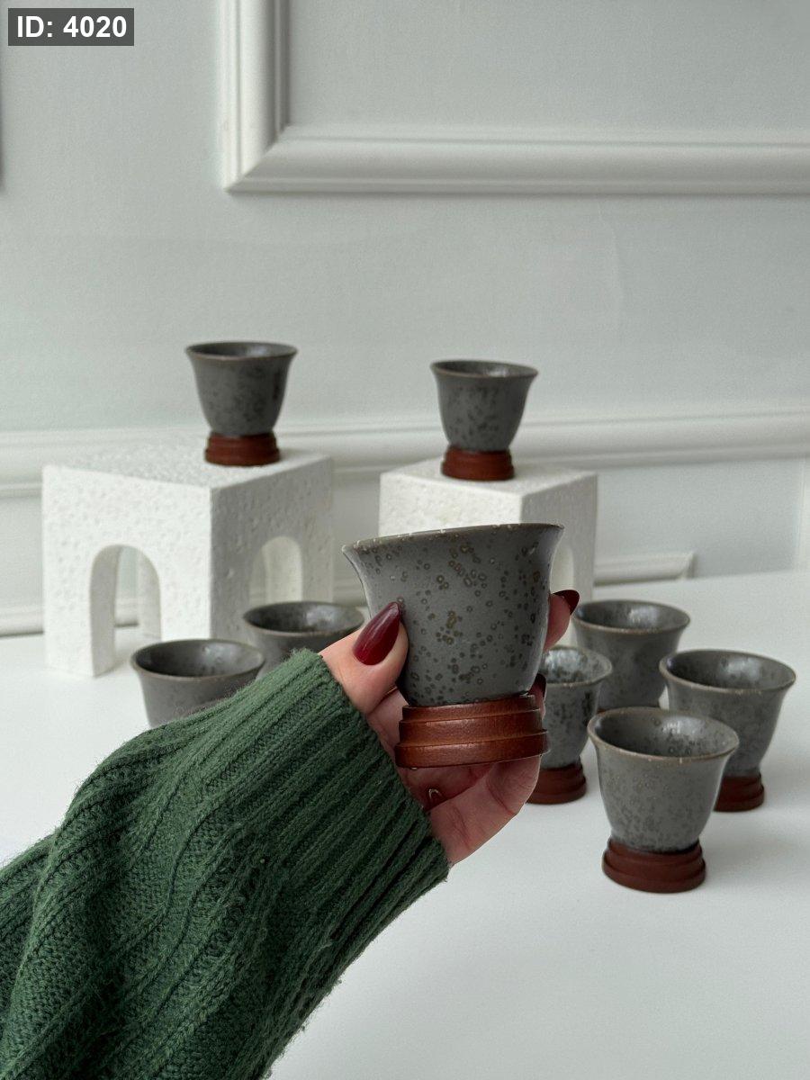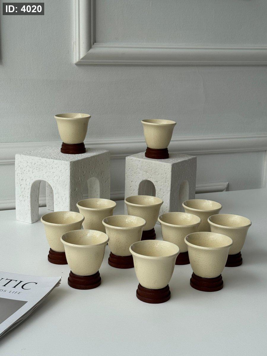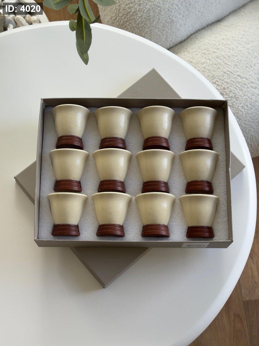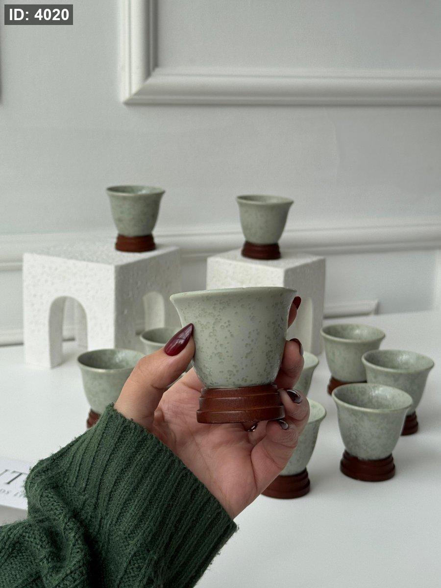 فناجين ساده بورسلان منقط قاعده خشب / 12
