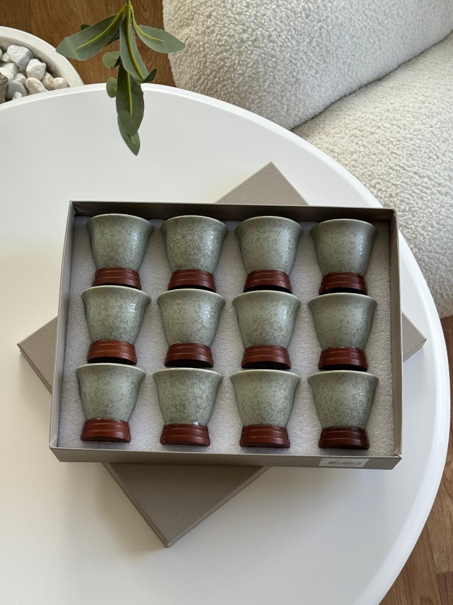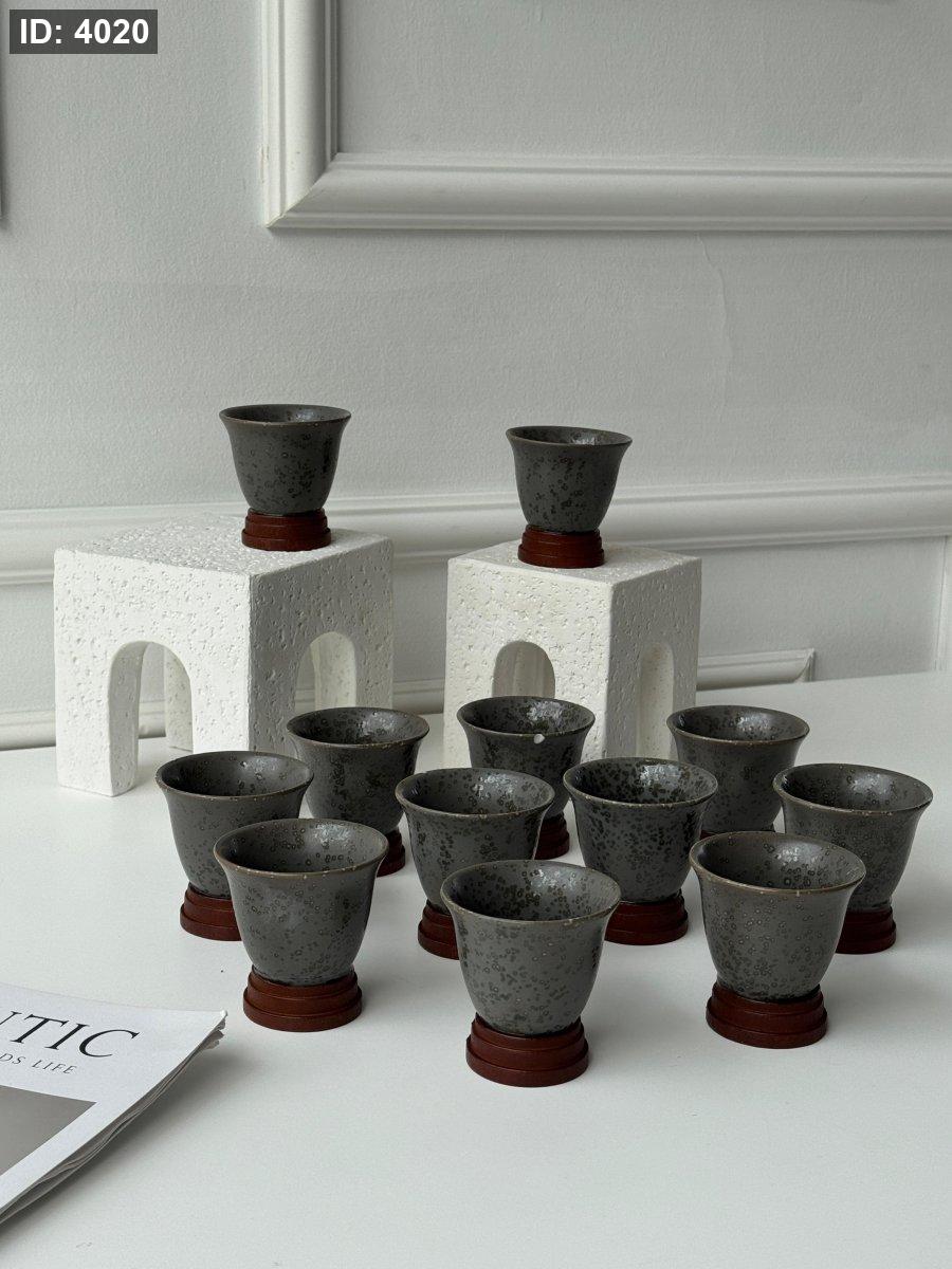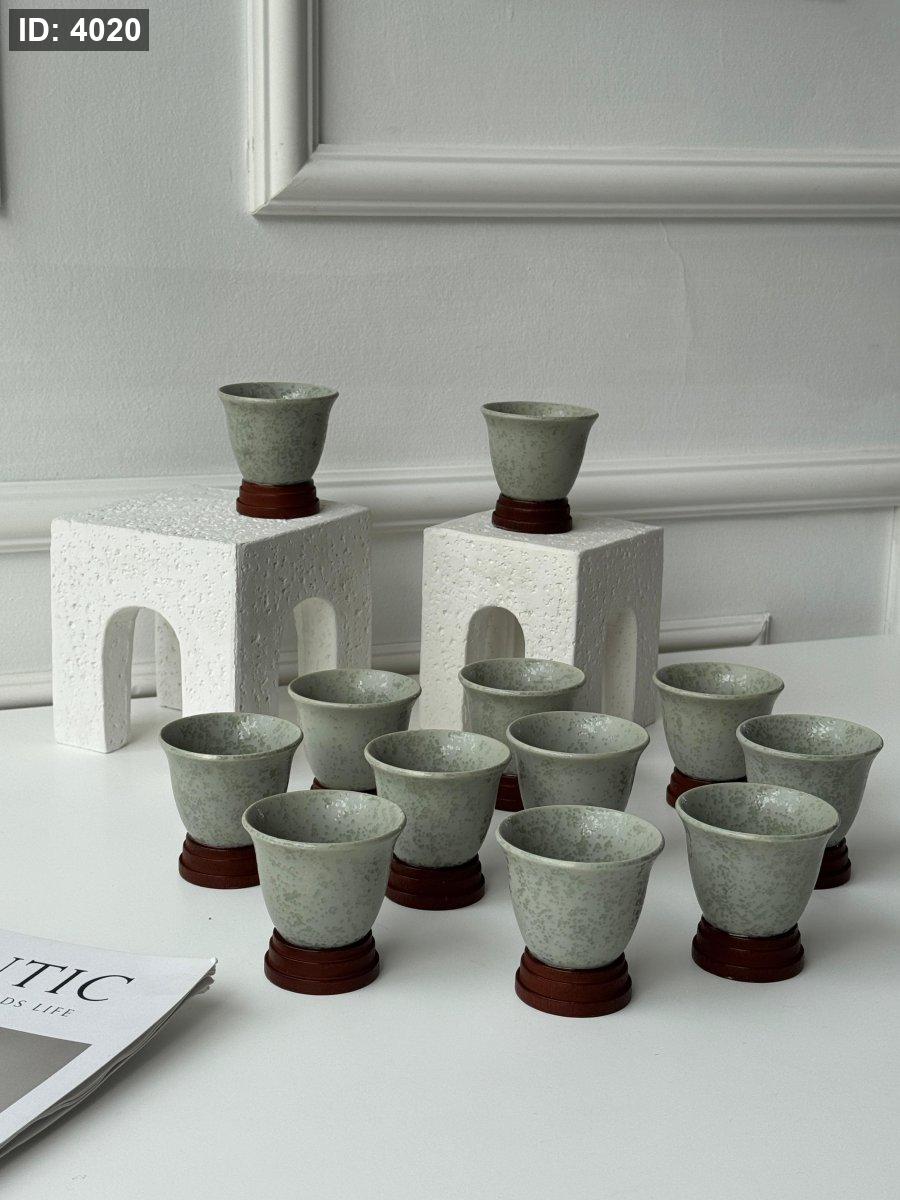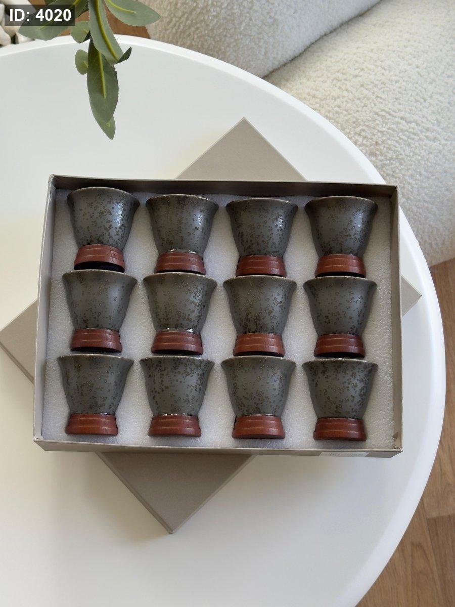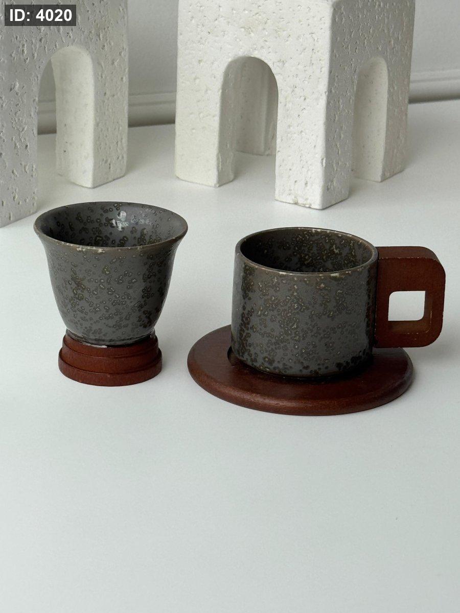 فناجين ساده بورسلان منقط قاعده خشب / 12